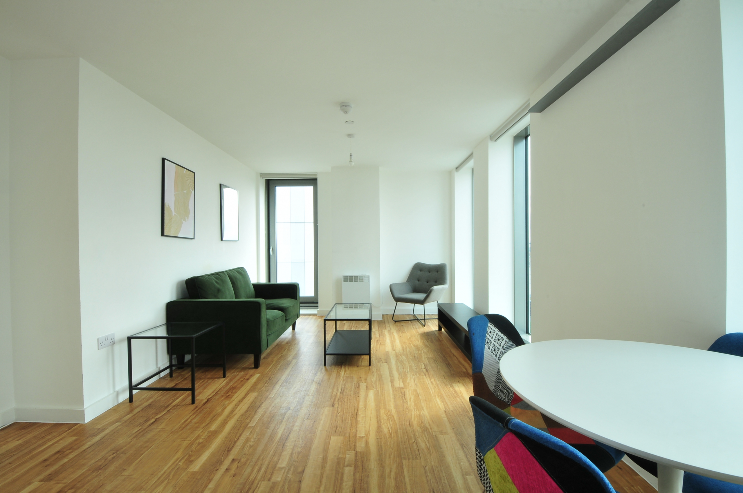 Flooded with natural light, the apartment features floor-to-ceiling windows with stunning panoramic views. It includes two spacious double bedrooms, one with an en-suite, a stylish family bathroom, a fully fitted modern kitchen, and an open-plan living and dining area. High-end furnishings complement the contemporary design.